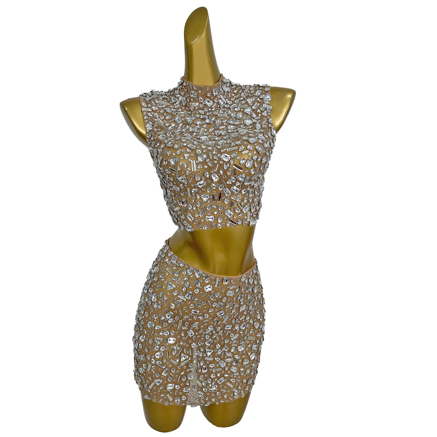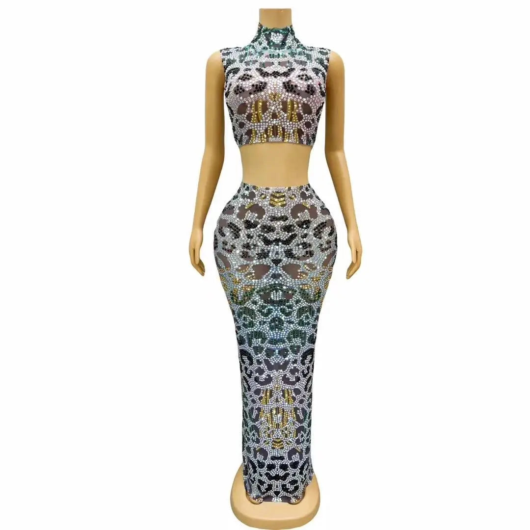 Women's Rhinestones Sleeveless Top Skirt Set Sexy Stretch Outfit Dance Stage Birthday Celebrate Costume Party Wear