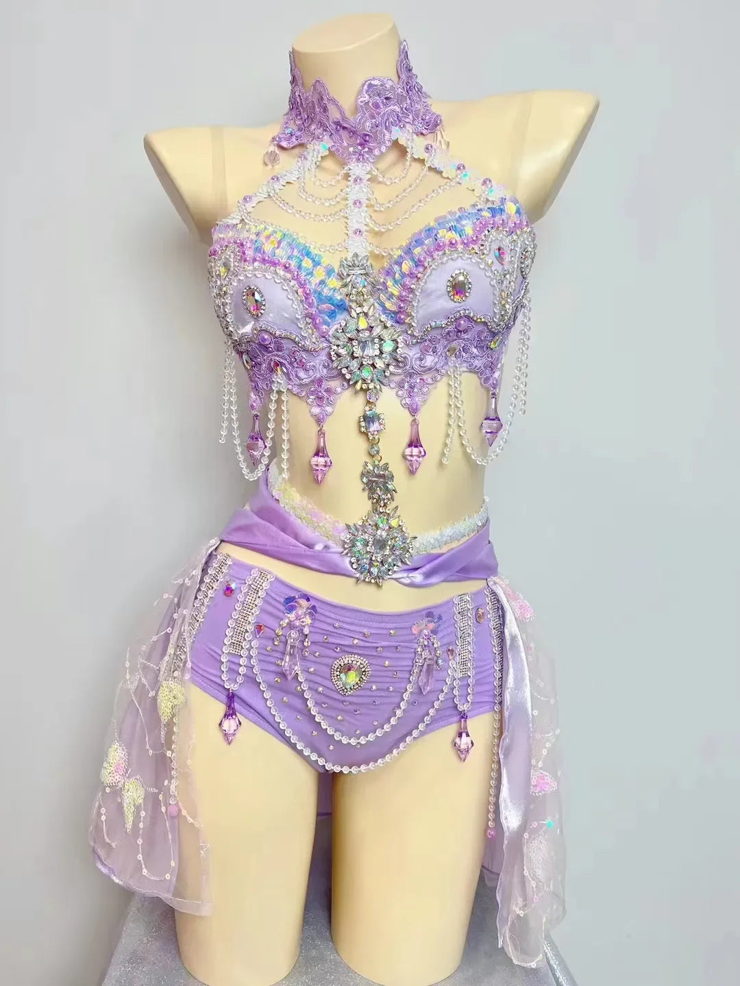Purple Scale Rhinestones Bikini Dance Costume Electric Music Festival Party Show Rave Outfits Mermaid Performance
