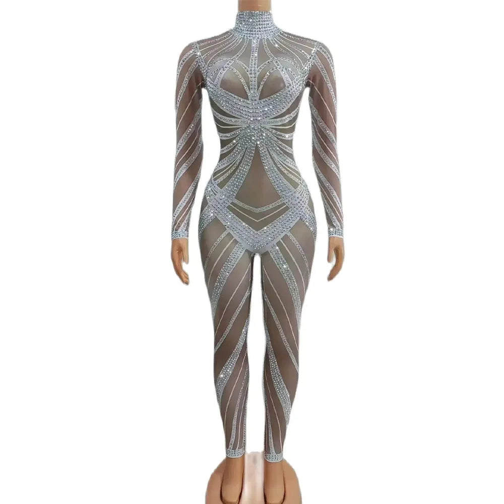 Sparkly Silver Rhinestones Stretch Jumpsuit Women Sexy Stage Dance Costume Nightclub Performance Party Birthday Rompers Jumpsuit