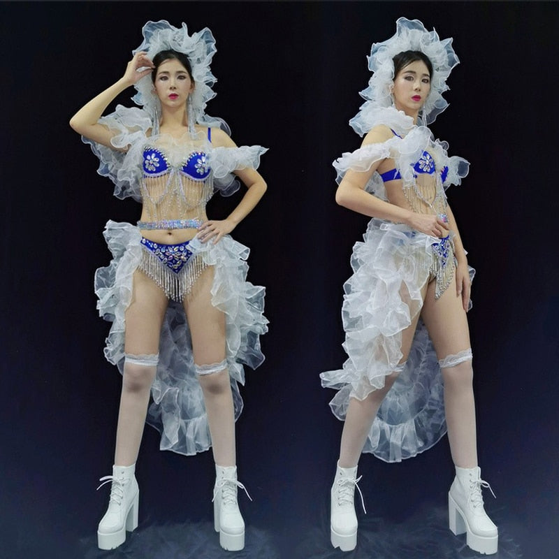 Sexy Shiny Rhinestone Bikini Pole Dance Costume Female Ruffle Mesh Gogo Dancing Clothes Nightclub Dancer Rave Outfit