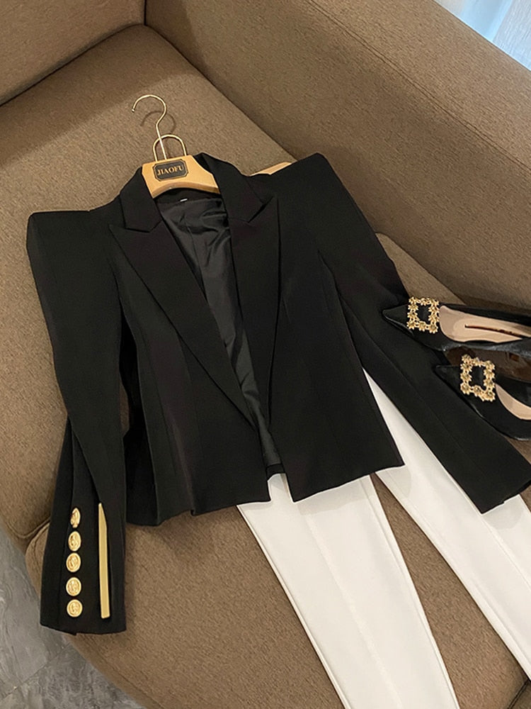 Fall Winter Spring Shrug Shoulder Coat High Street Basic Solid Long Sleeve Women Black Short Blazer