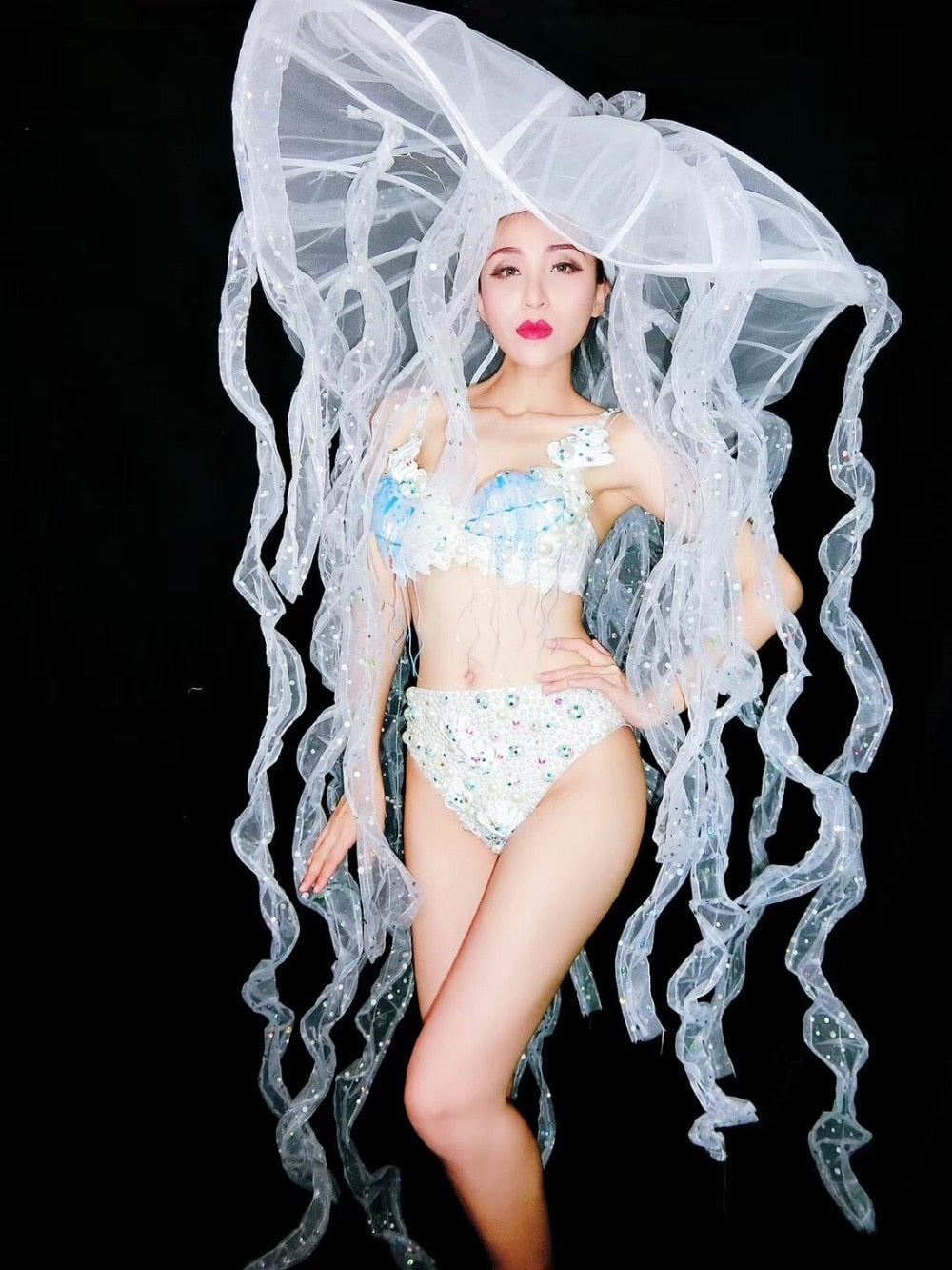 White Pearls Bikini Women Costume LED Crystals Bra Hat Nightclub Bar Stage Outfits Model Catwalk DJ Performance Dance Wear