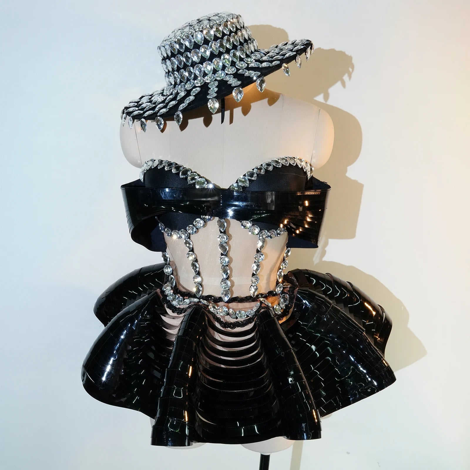 Women's Black 2PCS Top Skirt Sets Shiny Rhinestones Sequined Skirt Hat Prom Birthday Carnival Showgirl Drag Queen Costume