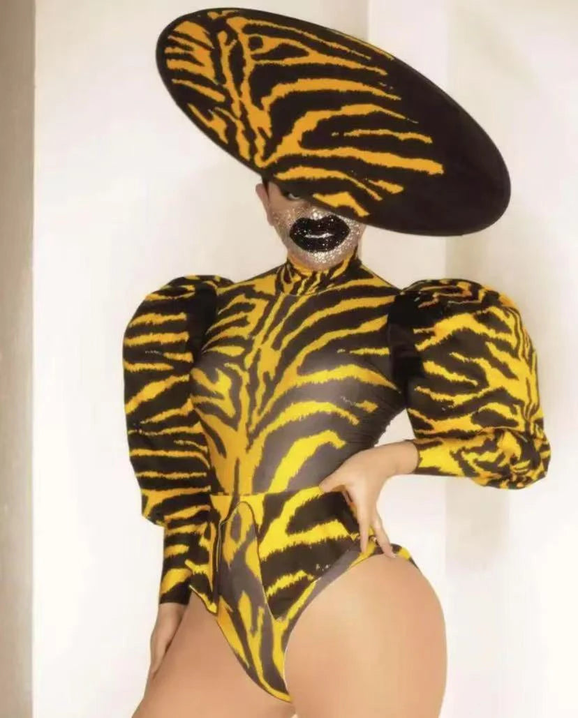 Retro Bubble Sleeve Printed Bodysuit+Hat Women Outfit Bar Gogo Performance Costume DJ Singer Nightclub DS Sexy Stage Party Wear