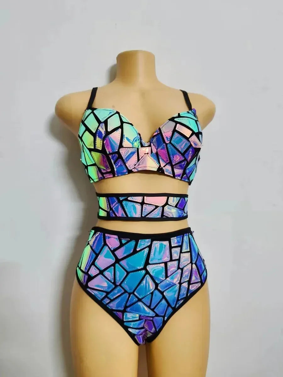 Purple Blue Laser Sequin Mirror Bikini++Cuff+Belt Bar Nightclub Pole Jazz Dance Outfit Dancer Singer Stage Club Party Costume