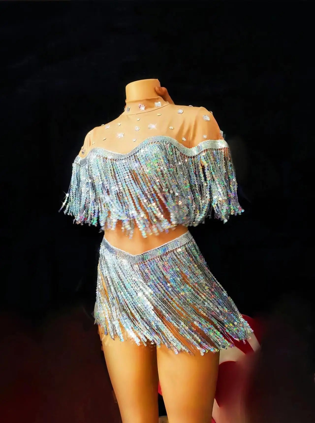 Silver Sequins Tassel Bikini Mesh Fringe CoatThree-piece Set Party Outfit Nightclub DanceCostume Singer Dancer Stage Wear
