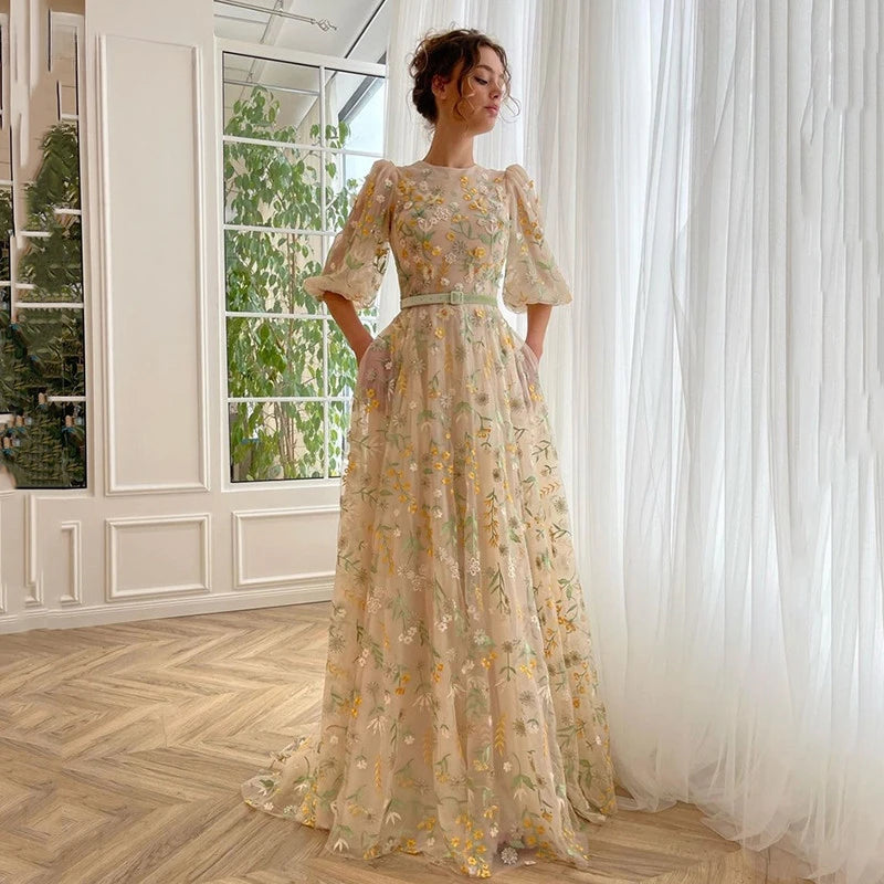 Customized O-Neck Embroidered Flowers Prom Dresses with Puff Half Sleeve Floral Long Evening Dress with Belt for Graduation
