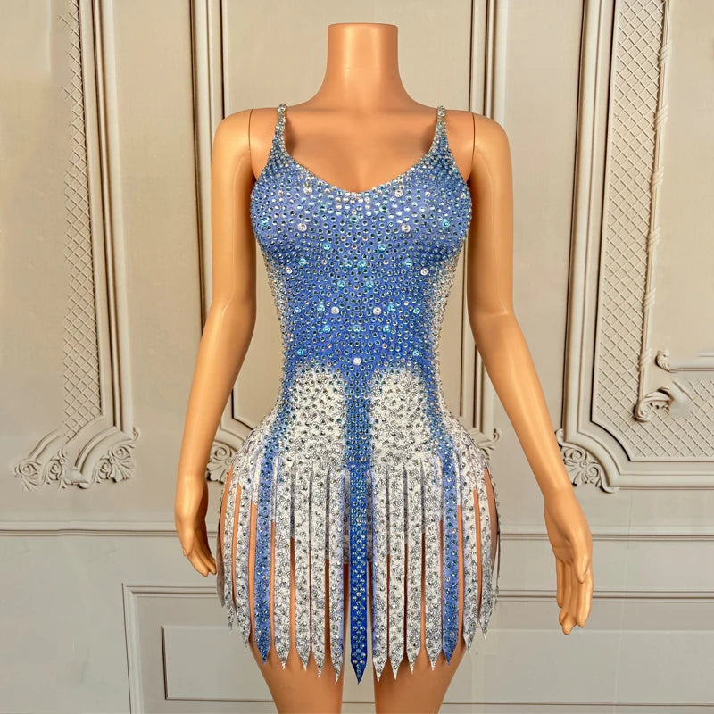 Sexy Pole Dance Outfits Women Blue Rhinestones Fringed Bodysuit Nightclub Dj Ds Party Gogo Costume Singer Stage Rave Wear