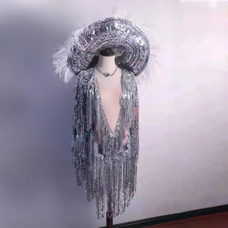 Sexy Silver Fringed Bodysuit Sparkling Sequin Leggings Latina Jazz Dancer Performance Costume Queen Drag Club Birthday Party