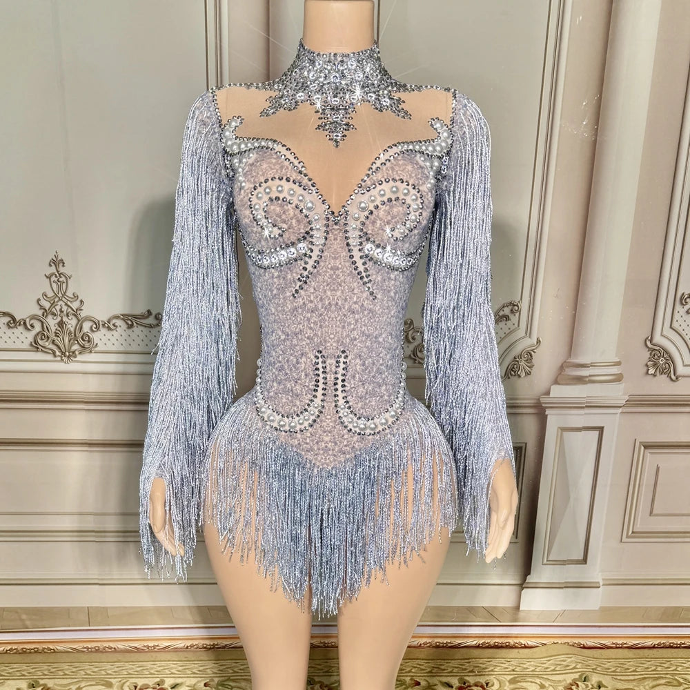 Women Sparkling Silver Rhinestone Sequin Tassel Party Bodysuit Stretch Dance Fringes Jumpsuit Club Dj Singer Leotard Stage Wear