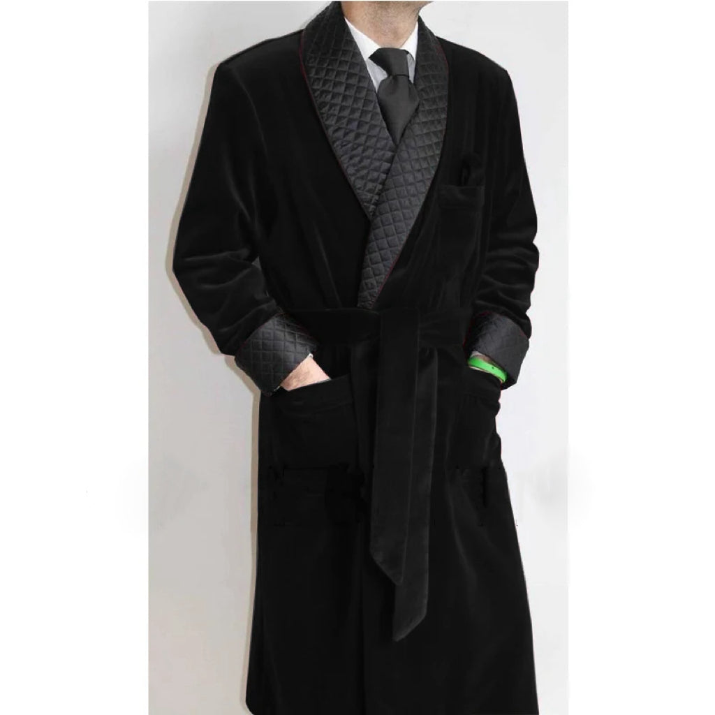Men's Red Velvet Robe with Black Quilted Collar and Belt