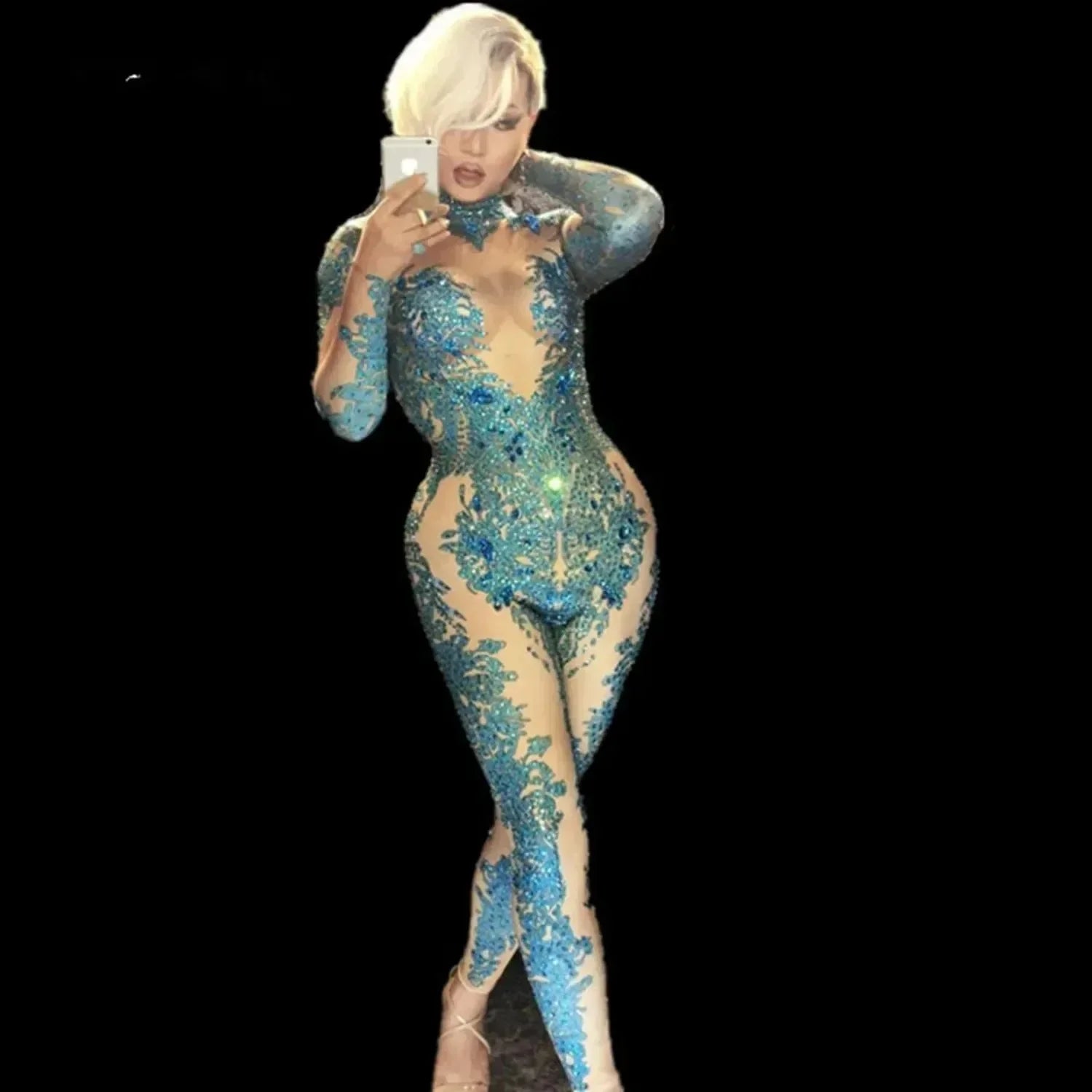 AB Rhinestones Sparkly Jumpsuit Fashion Sexy Nude Big Stretch Dance Costume One-piece Bodysuit Birthday Outfit Party Leggings