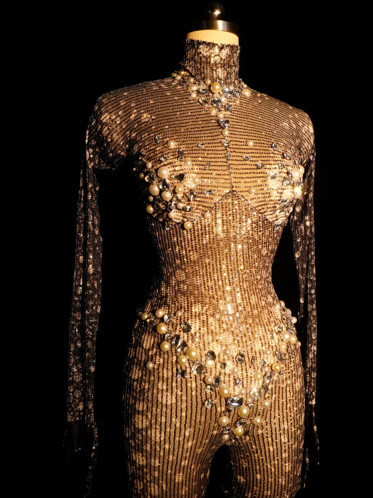 Sexy Black Sequined Jumpsuit Rhinestone Bodysuit Long Sleeves Club Rave Pole Stage Drag Queen Festival Outfits Halloween