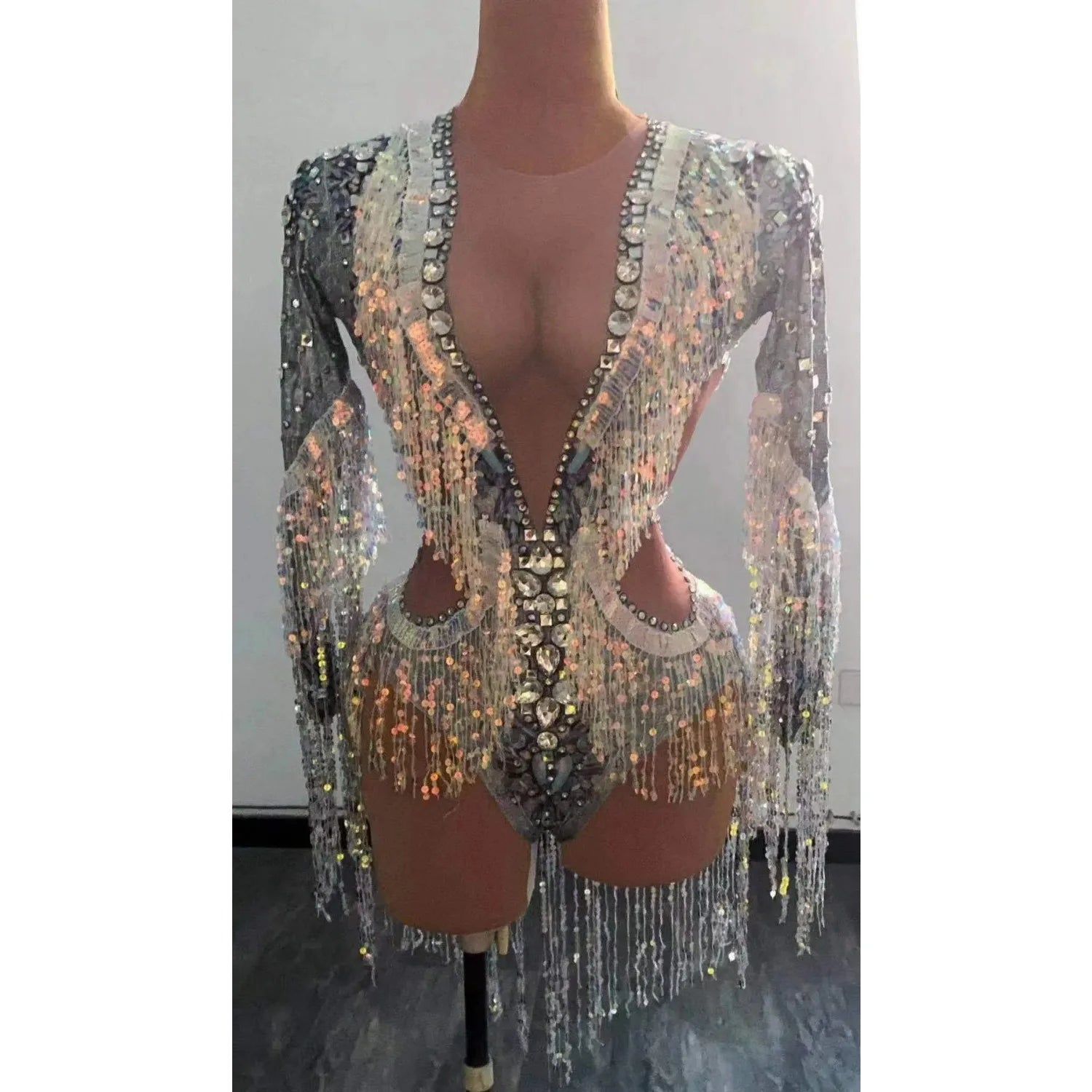 Sexy Hollow Out Rhinestones Bodysuit Pole Dance Costume Pearls Tassel Drag Queen Outfit Singer Performance Stage Photoshoot Wear