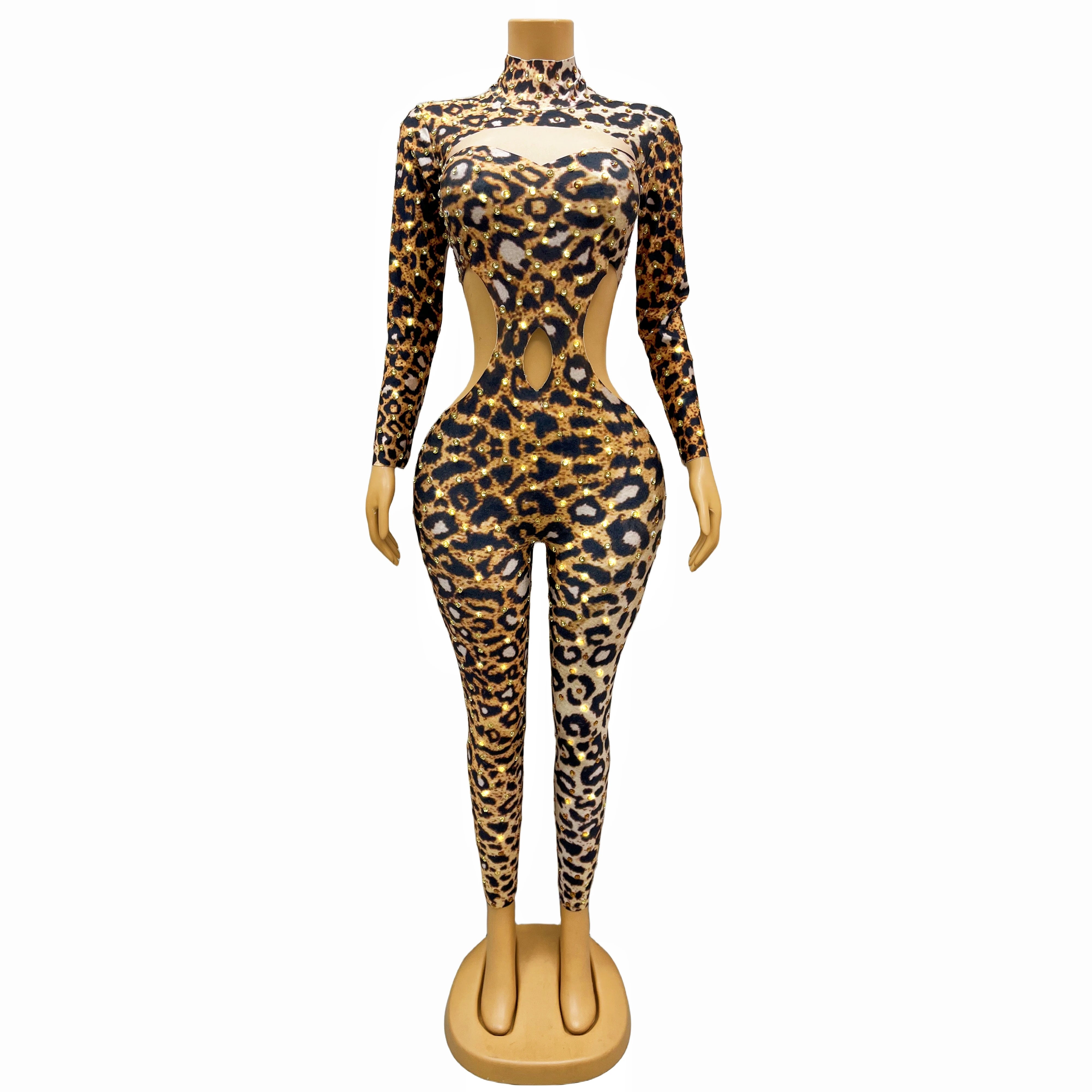 Sexy Leopard Gold Rhinestones Bodysuit Spandex Hollow Waist Jumpsuit Outfit Birthday Party Dance Collections