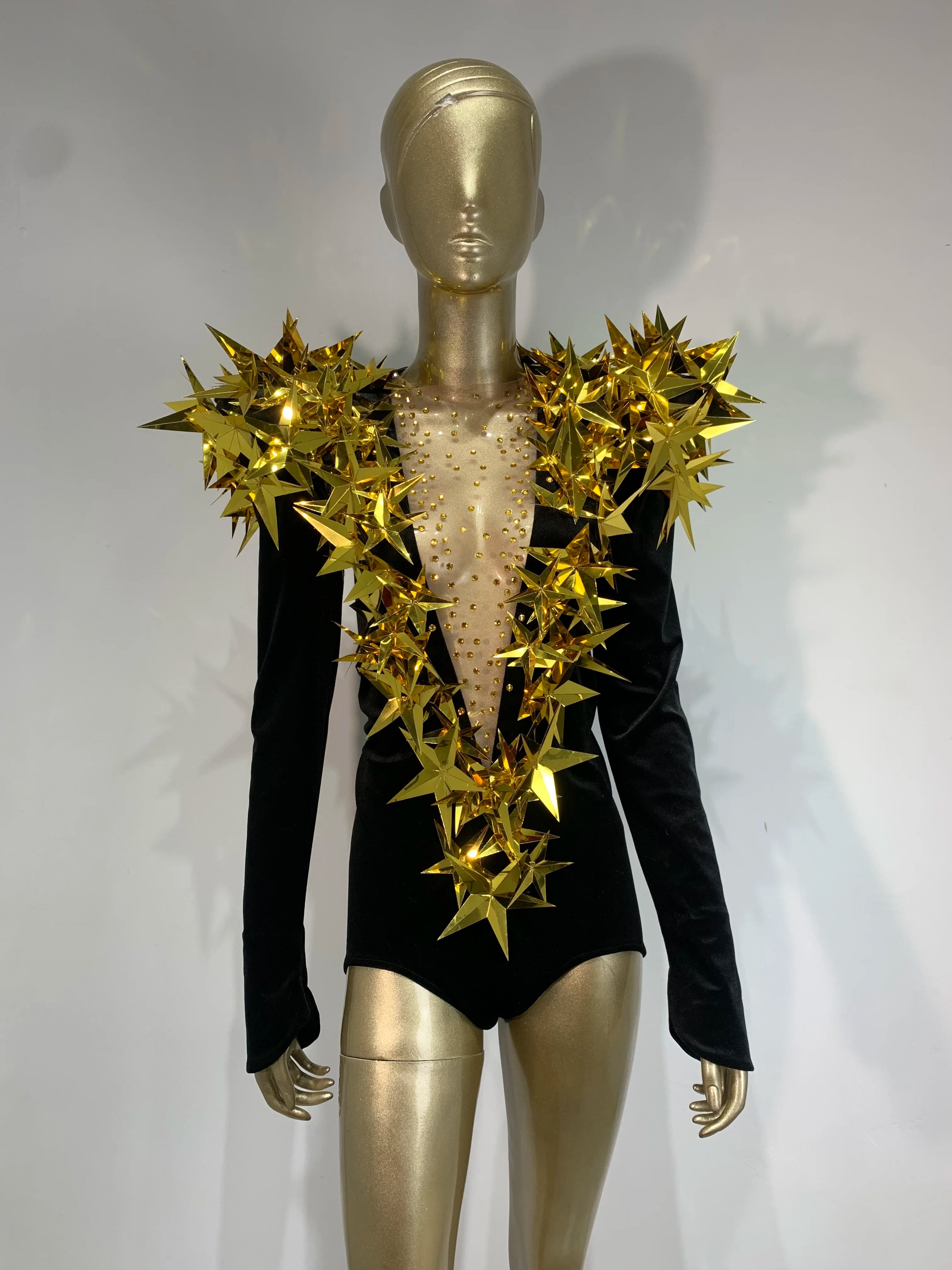 Women Sexy Gold Sequin Diamond Velvet Long Sleeves Bodysuit Evening Party Costume Singer Stage Perform Nightclub Outfit