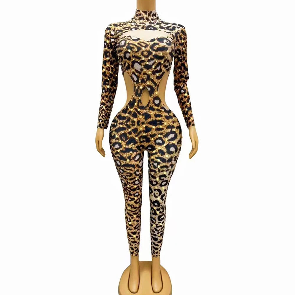 Sexy Stage Leopard Gold Rhinestones Bodysuit Spandex Hollow Waist Jumpsuit Outfit Birthday Party Dance Photoshoot Collections