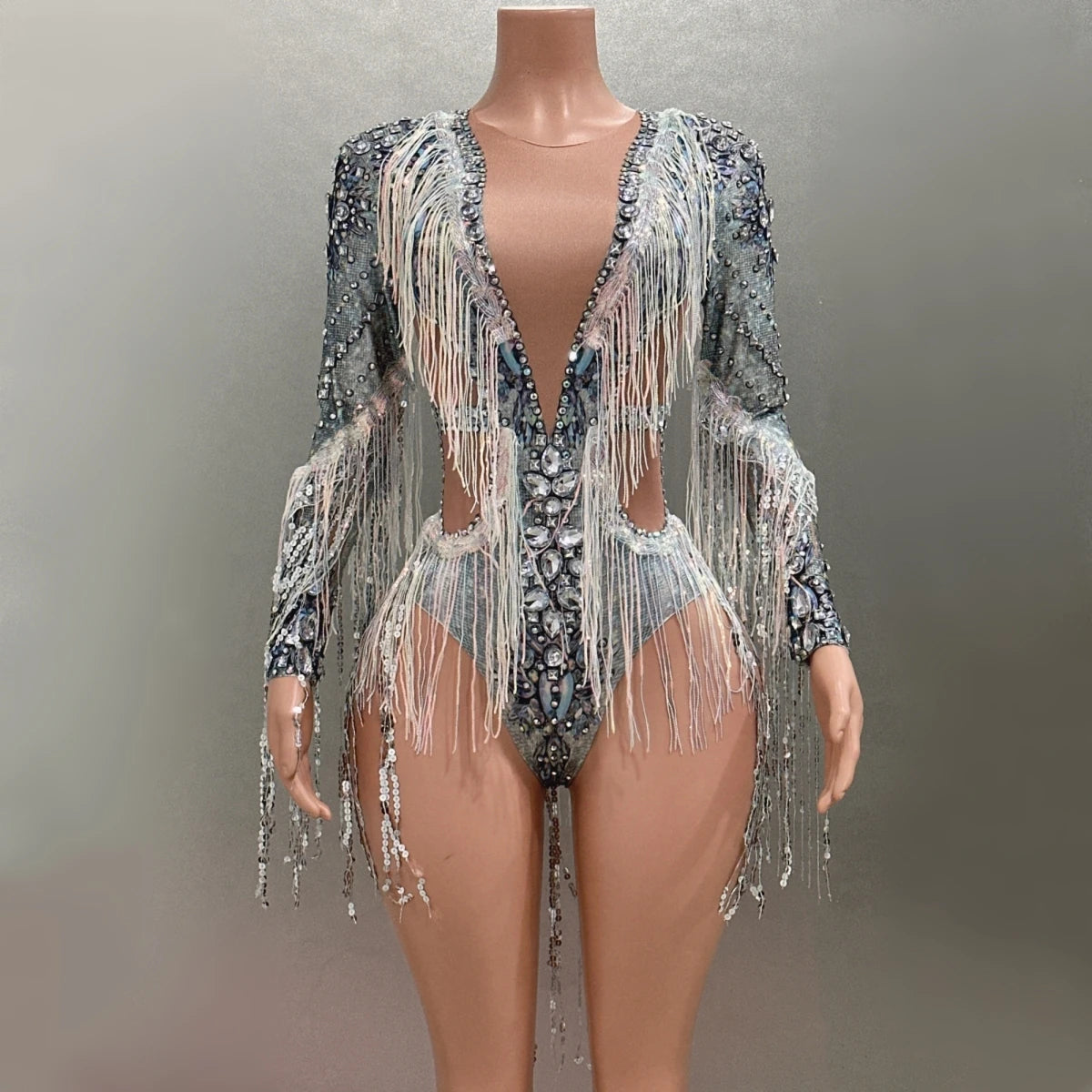 Women's Pearls Bodysuit Singer Performance Outfit Night Club Rhinestones Fringes Stage Costume Long Sellve Dance Leotard