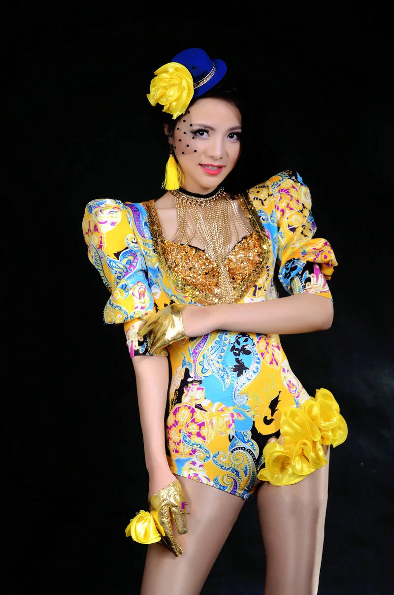 New Jazz Dance Costumes Yellow Fashion Print Bodysuit Pole Dancing Clothes Nightclub Dj Female Hip Hop Outfit Rave Stage Wear
