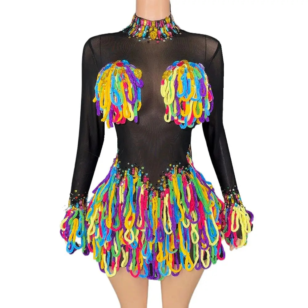 Sparkly Rhinestones Colourful Tassels Bodysuit Women Sexy Mesh See Through Performance Dance Costume Dancer Stage Wear