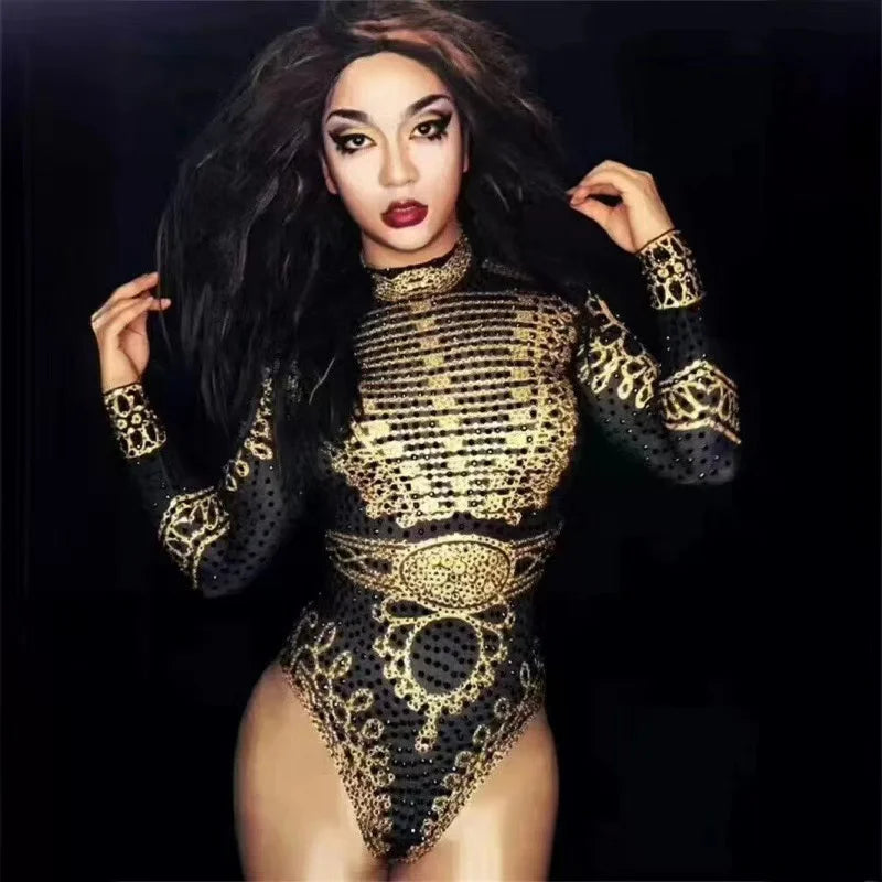 Sleeve Female Singer Performance Leotard Sparkly Gold Rhinestones Bodysuit Long Sleeve Female Singer Performance