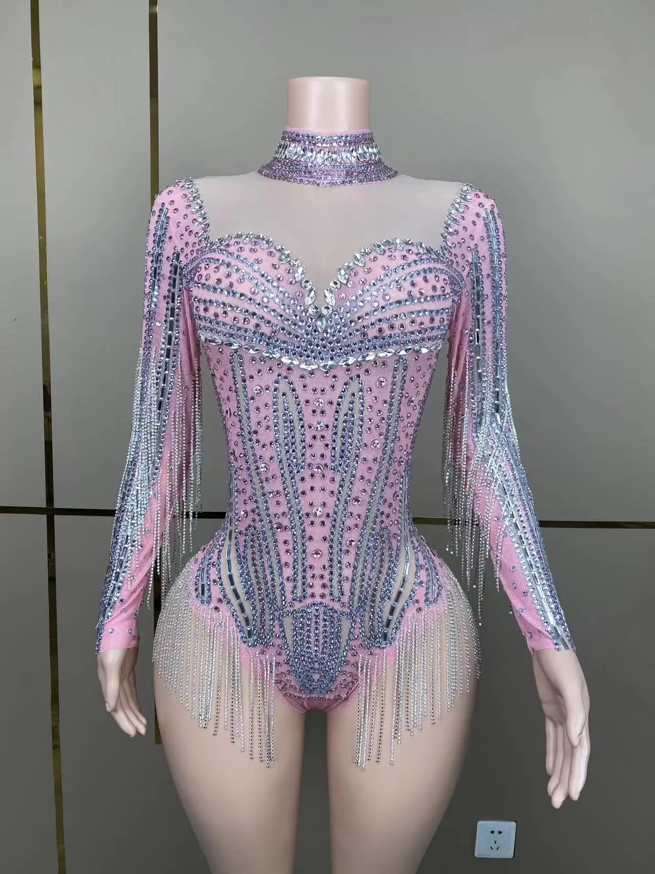 Pink Siver Rhinstone Tassel High Collar Bodysuit Evening Dress Drag Queen Club Party Birthday Special Ocassion Sexy Costume Rave