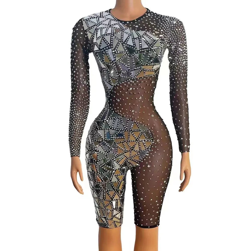 Sparkly Mirrors Silver Rhinestones Black Mesh Bodysuit Women Evening Party Birthday Rompers Sexy Stage Photo Shoot Rompers