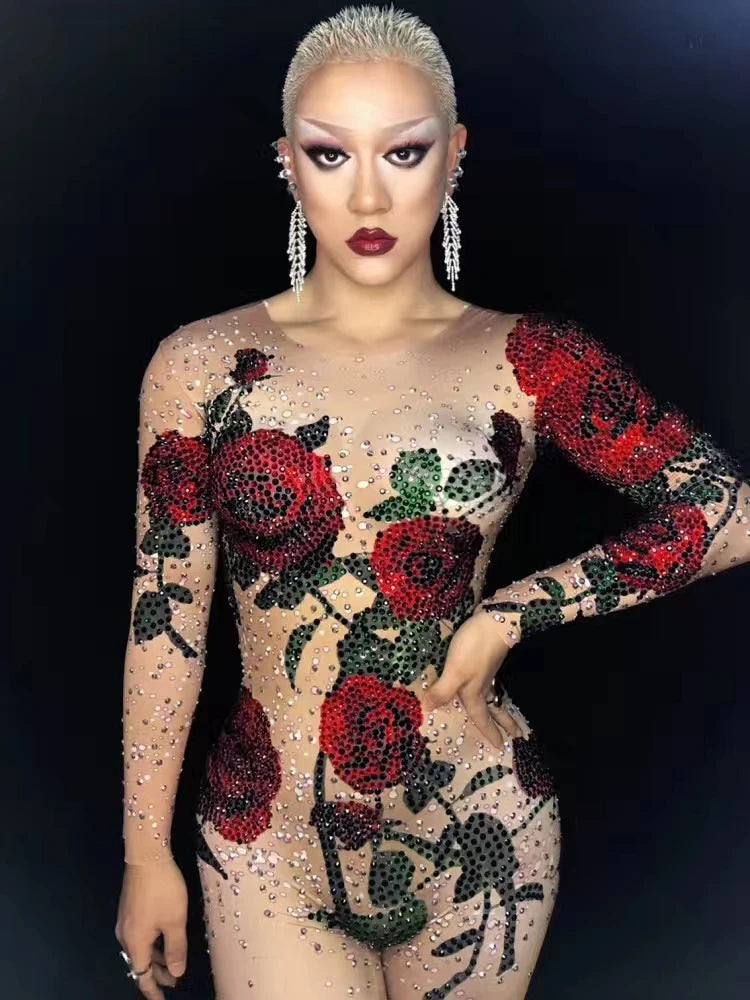 Designer Rose Pattern Rhinestone Bodysuits Stretch Leotard Nightclub DJ Stage Pole Dancing Costumes Women Performance Jumpsuit