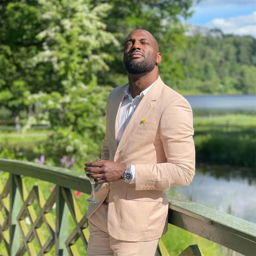 Men's Suit Design Beige Linen Two Button Boyfriend Suit for Wedding New Slim Fit Full Formal 2 Pieces (Jacket+Pants)