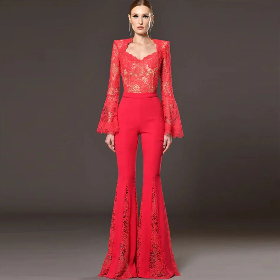 Sexy Lace Top Slim Stitching Mop Pants Solid Color Two-piece Suit