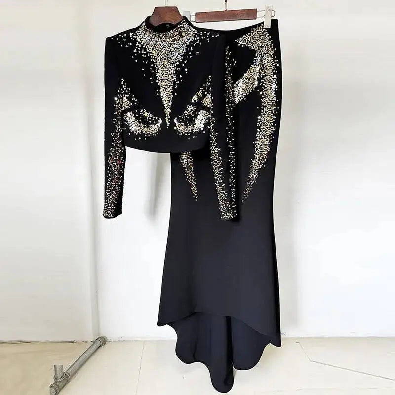 Luxury Sequin 2 Piece Set Women Long Sleeve Jacket Coat Mermaid Fishtail Maxi Skirts Suit 2pcs Outfits Formal Evening Dresses