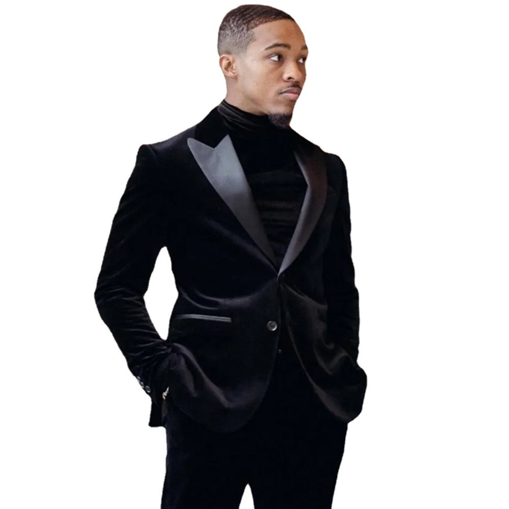 Velvet Men Suits Slim Fit Groomsmen Wedding Tuxedos 2 Pieces Sets Black Peaked Lapel Blazers Formal Suit With Jacket And Pants