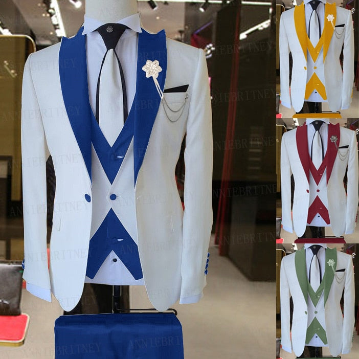 3 Pieces Groom Wedding Suits Men Blazer Sets White Business Jacket Vest Royal Blue Pants Dress Tuxedo