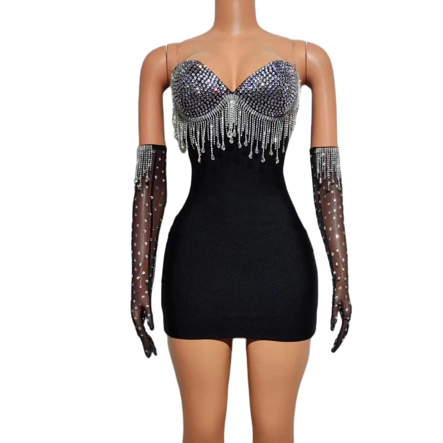 Fashion Crystals Tassel Rhinestone Party Short Dress Women Club Dress Sexy Jazz Singer Dancer Stage Costumes with Gloves