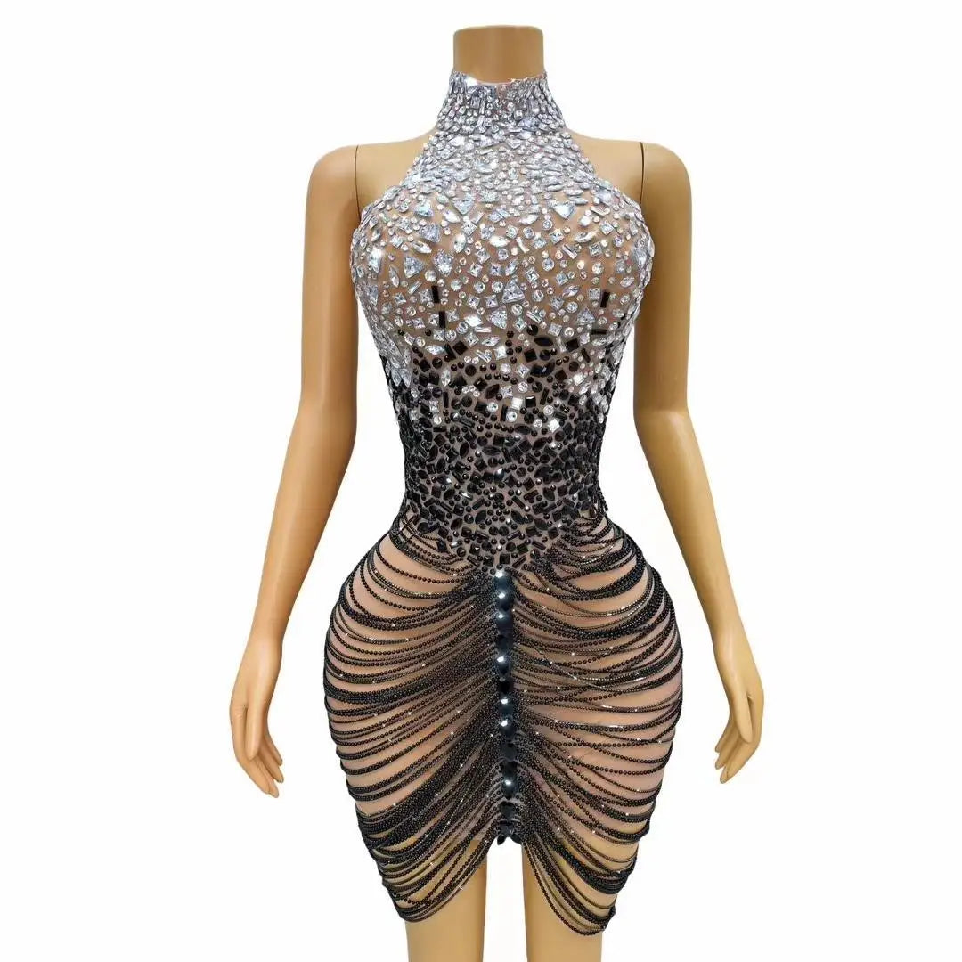 Black Drill Chain Fringed Diamonds Dress Women Party Jazz Dance Rave Outfit Gogo Costumes Stage Performance Clubwear