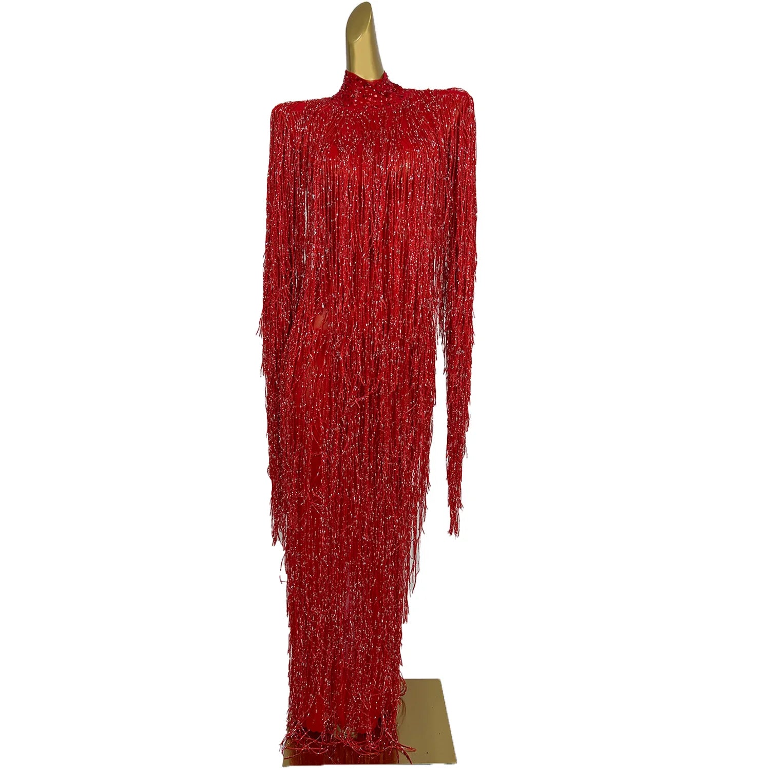 Full Tassel Dress Long Sleeves Stretch Party Fringes Dress Women Singer Stage Performance Dress Dance Costumes Shizichangqun