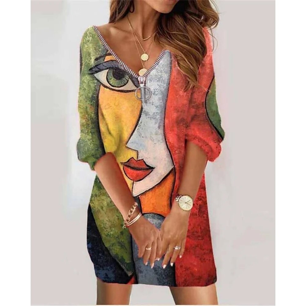 Autumn All Over Figure Print Zipper Detail Casual Dress Femme Casual Half Sleeve V-Neck Mini Robe Office Lady Outfits