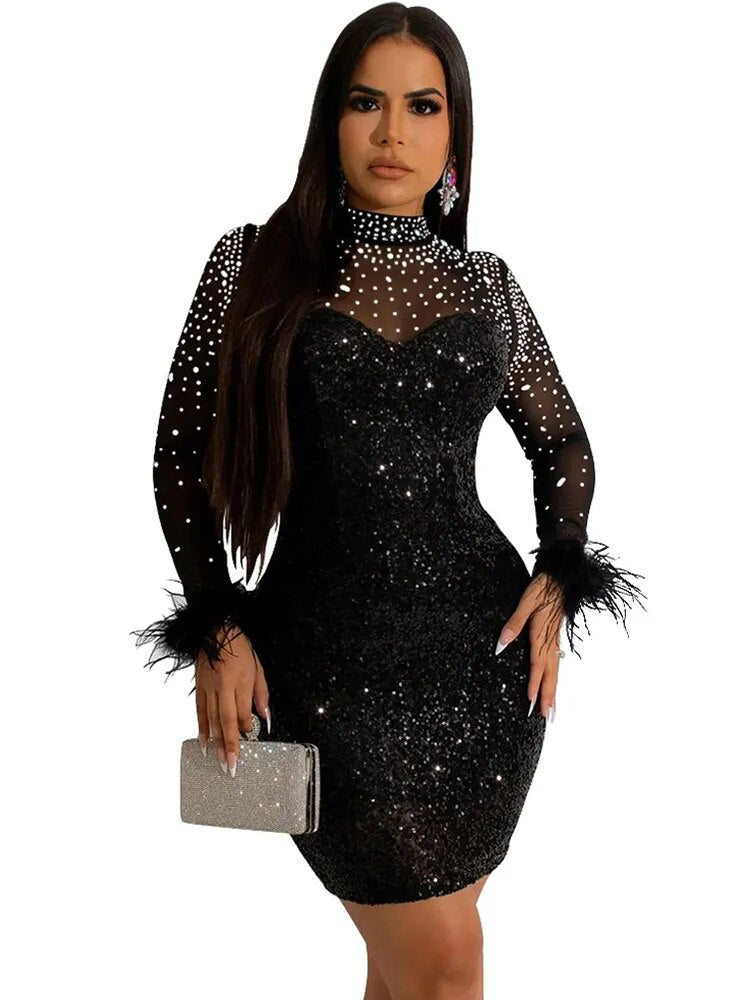 Sexy Mesh Rhinestone Sequin Feather Prom Mini Dresses See Through Night Club Outfits Party Sexy Clubwear Diamond Short Dress