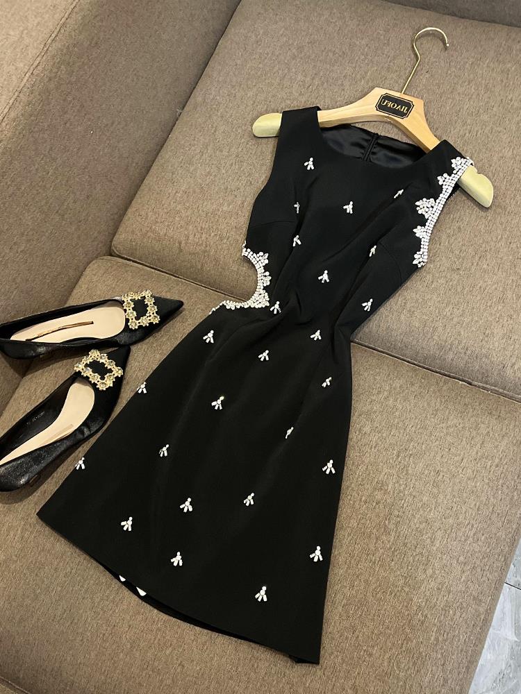 Workmanship Luxury Rhinestone Hollow Out Waist Sleeveless Woman O-neck Party Black Small Dress