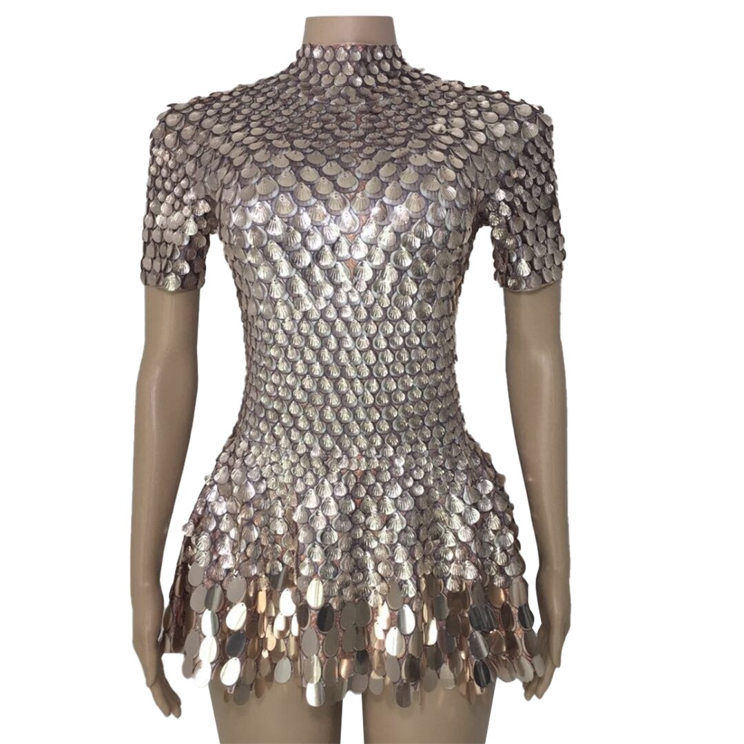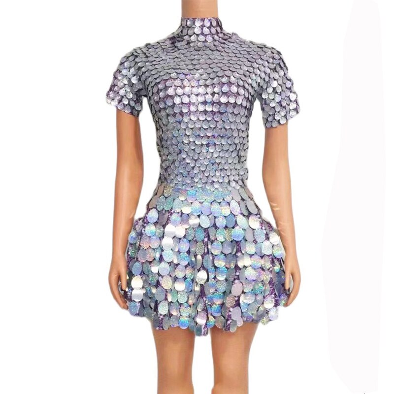 Shining Sequins Mini Dress Costume Celebrate Bodysuit Women Birthday Silver Dresses Nightclub Leotard Drag Queen Dance Costume