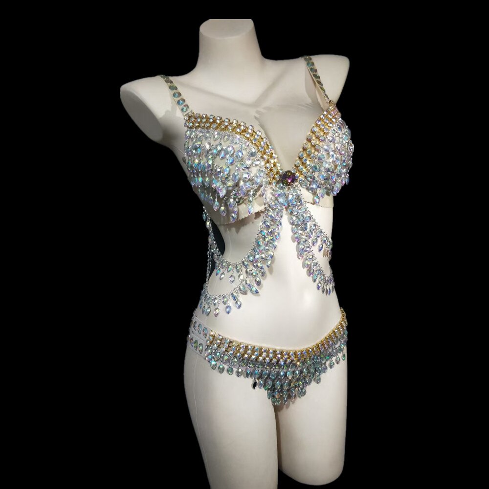 Sparkling Rhinestone Tassel Bikini Outfit Sets with Mesh Trailing Dress Women Sexy Crystal Bra + Shorts Dancer Singer Stage Wear