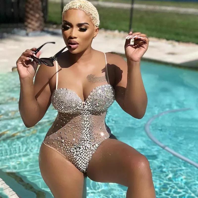 Womens Dresses Bling Diamonds Sexy See Through Low Cut Short Bodysuit One Piece Rompers for Pool Party Nightclub Dance Clothes