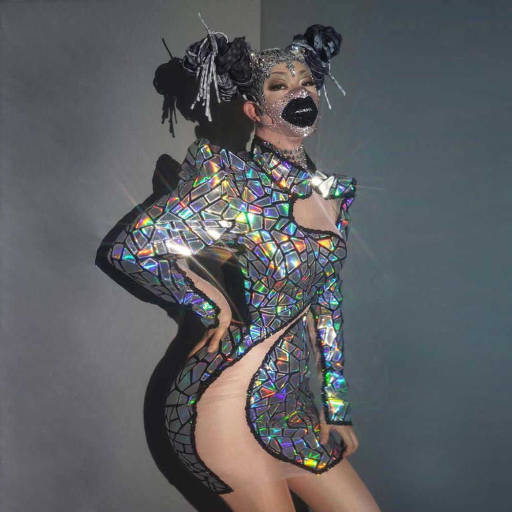 Hollow Out Patchwork Mesh Sequin Party Dress Women Backless Prom Bodycon Dress Nightclub DJ Singer Dance Stage Wear