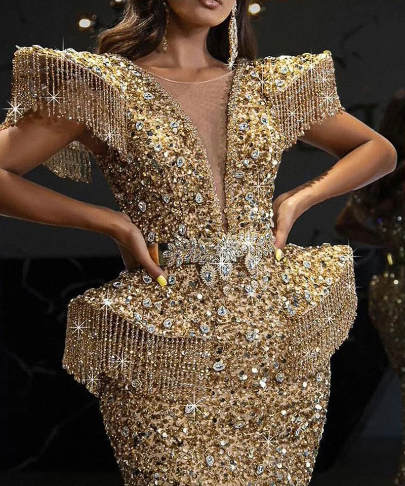 Sexy Golden Sequin Tassel Deep V-neck Full Dress Long Sleeves Women Bride Dress