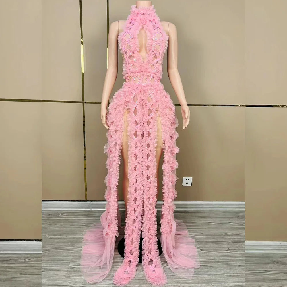 Sexy Pink Rhinetones Flowers Sleeveless Dress Birthday Evening Celebrate Costume Dance Birthday Party Evening Photoshoot Dress