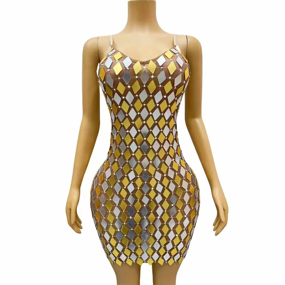 Sexy Stage Silver Gold Mirrors Rhinestones Dress Birthday Prom Shining Crystals Outfit Evening Celebrate Photoshoot Costume