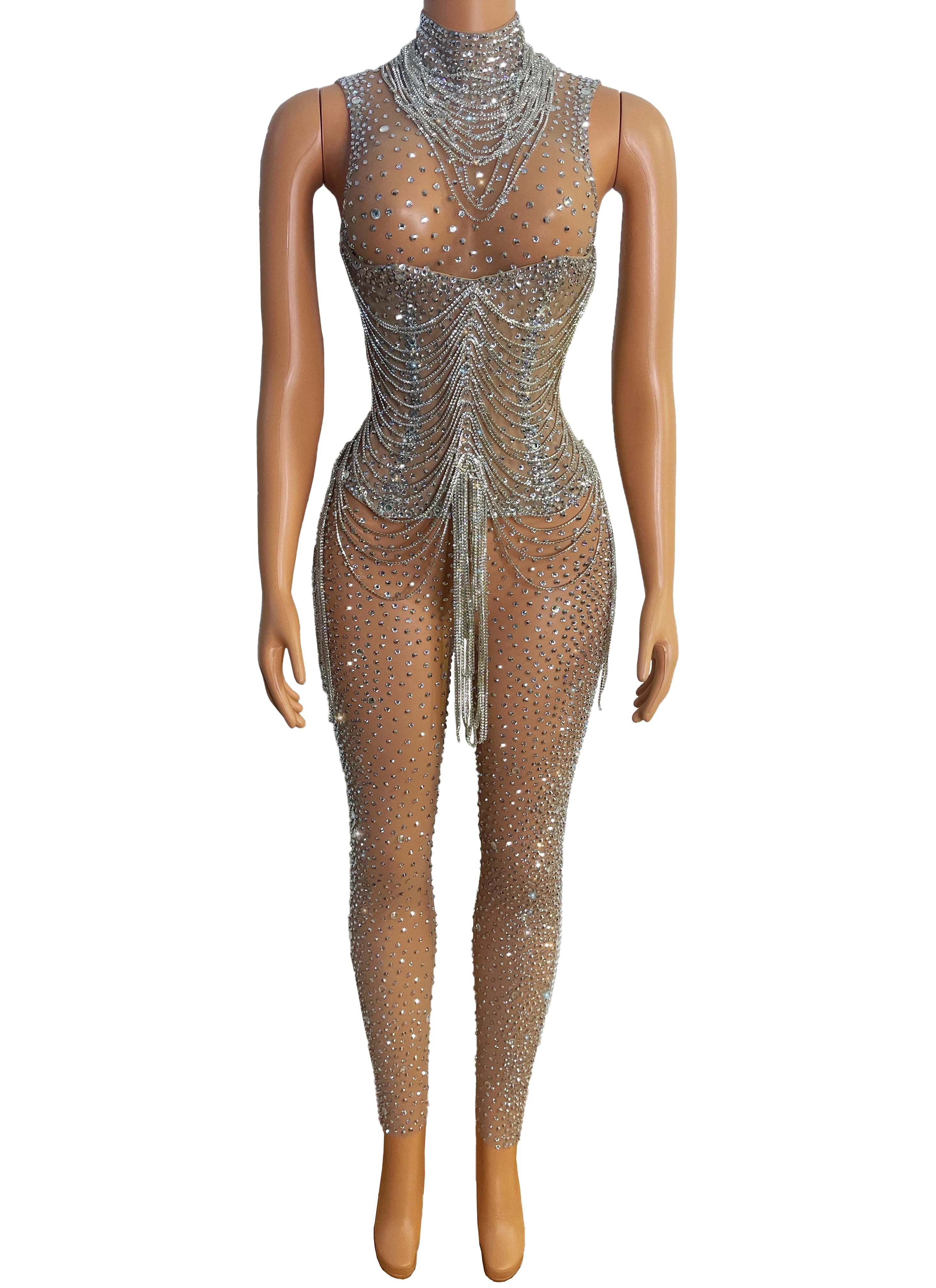 Silver Crystals Girdle Jumpsuit Transparent Mesh Rhinestones Bodysuit Birthday Celebrate Outfit Evening Sexy Dress Costumes