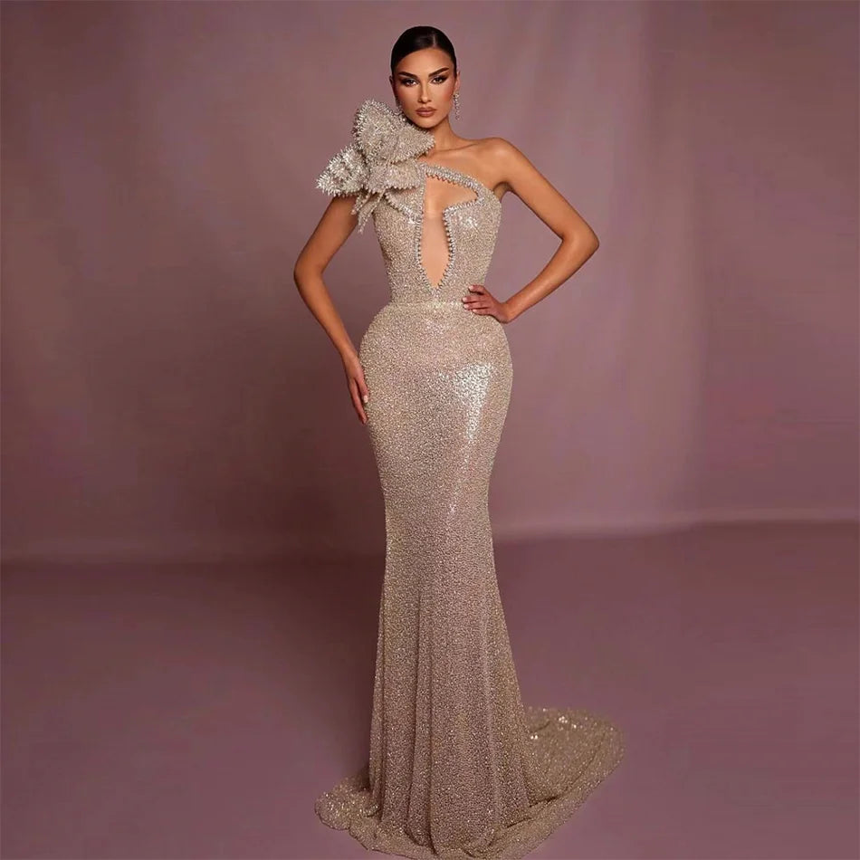 Flower Petals with Pearls Rhinestone Chains Decorated One Shoulder Cut Out High Waist Pleated Mermaid Sequin Maxi Dress