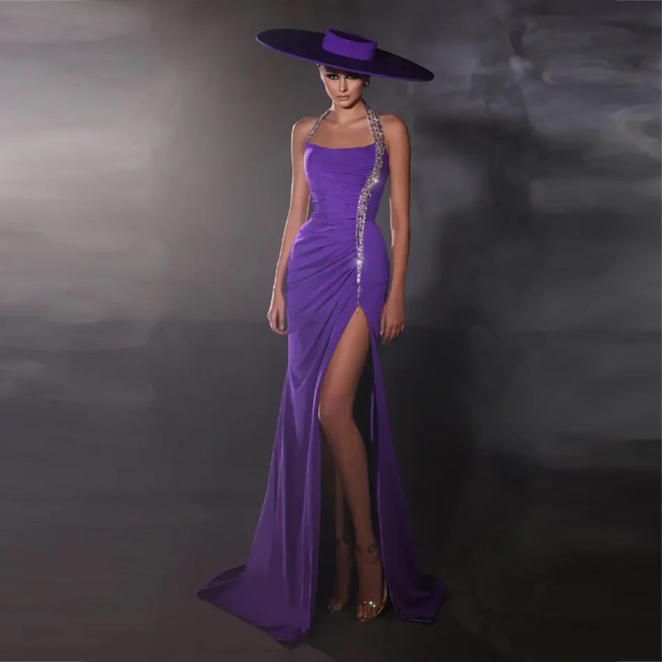 Purple Colorful Rhinestones Beaded Halter Neck Pleated Split Maxi Dress Fashion Women Backless High Waist Draped Party Gown