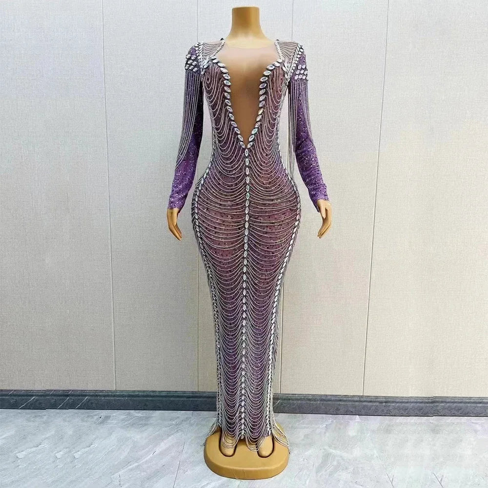 Sexy Maxi Dress Evening Party Performance Costume Sparkly Rhinestones Chain Women Long Sleeve Bar Singer Stage Wear